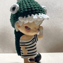 2.Bright green yarn paired with white eyes and spike decorations